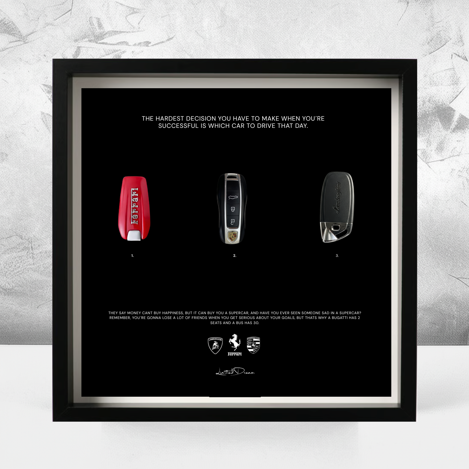 Dieses Kunstwerk spricht zwei Arten von Menschen an: Die, die es schon geschafft haben – und die, die noch auf dem Weg sind. Drei Schlüssel – Ferrari, Porsche, Lamborghini – stehen für Erfolg, Freiheit und die Früchte harter Arbeit.